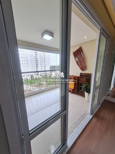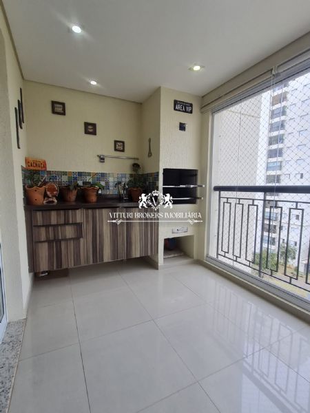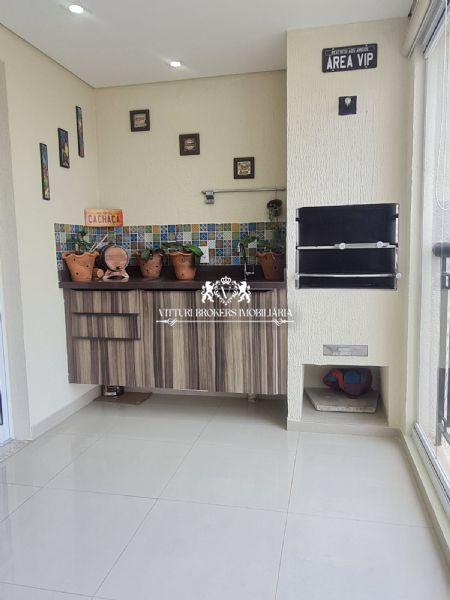 Área gourmet com churrasqueira, pia e fechamento em vidro.