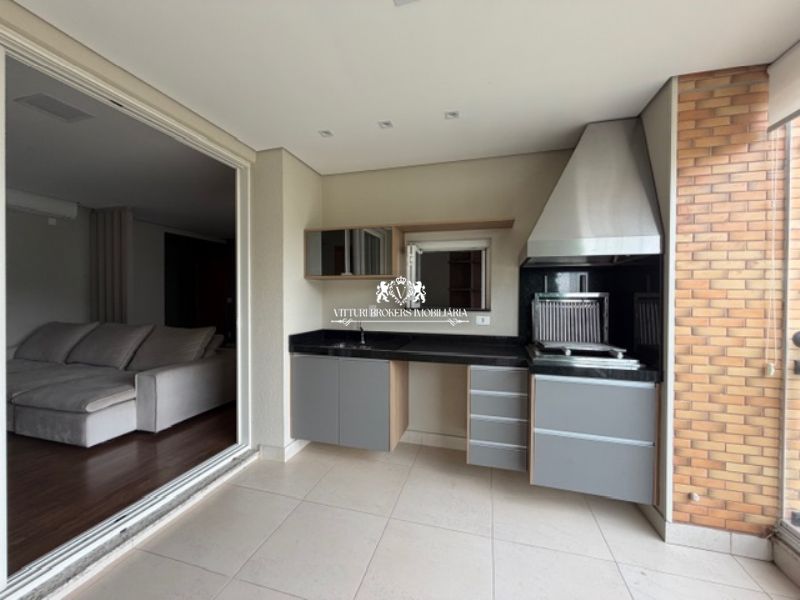 Varanda gourmet com churrasqueira, armários planejados, fechamento em vidro temperado e persiana contra luz solar, além de infraestrutura para ar condicionado.