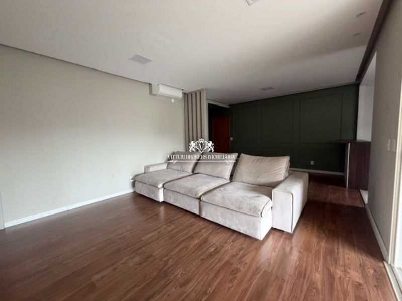 Ampla sala para 2 ambientes, ar condicionado, teto rebaixado em gesso com luminárias LED, espaçoso sofá de couro italiano, rack em madeira para TV e som.