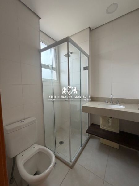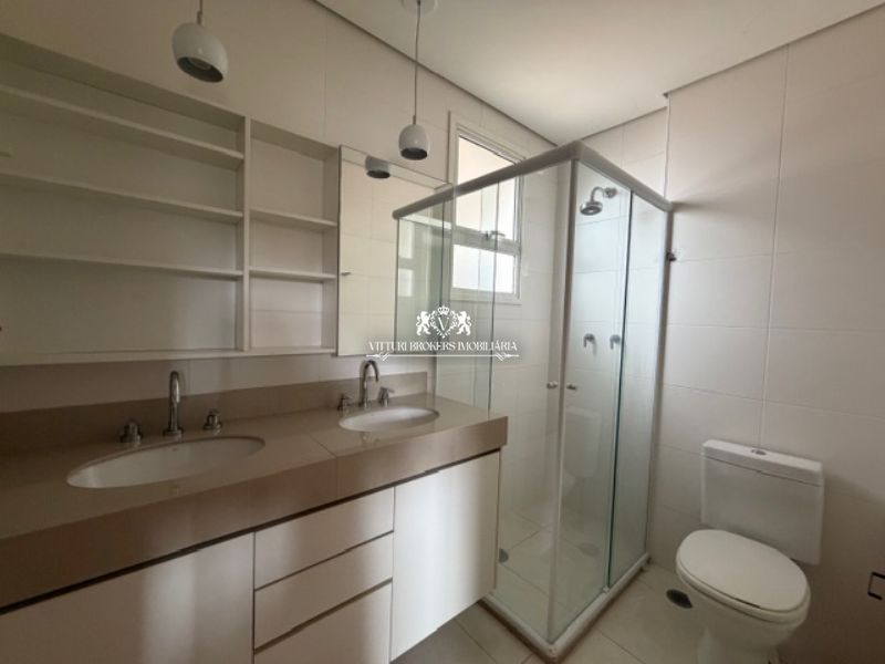 Banheiros completos com box em vidro temperado, ducha, cuba embutida, armários planejados e espelho.