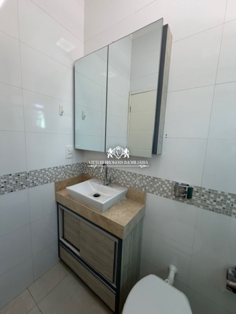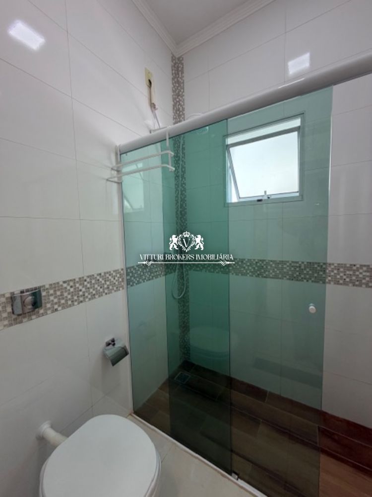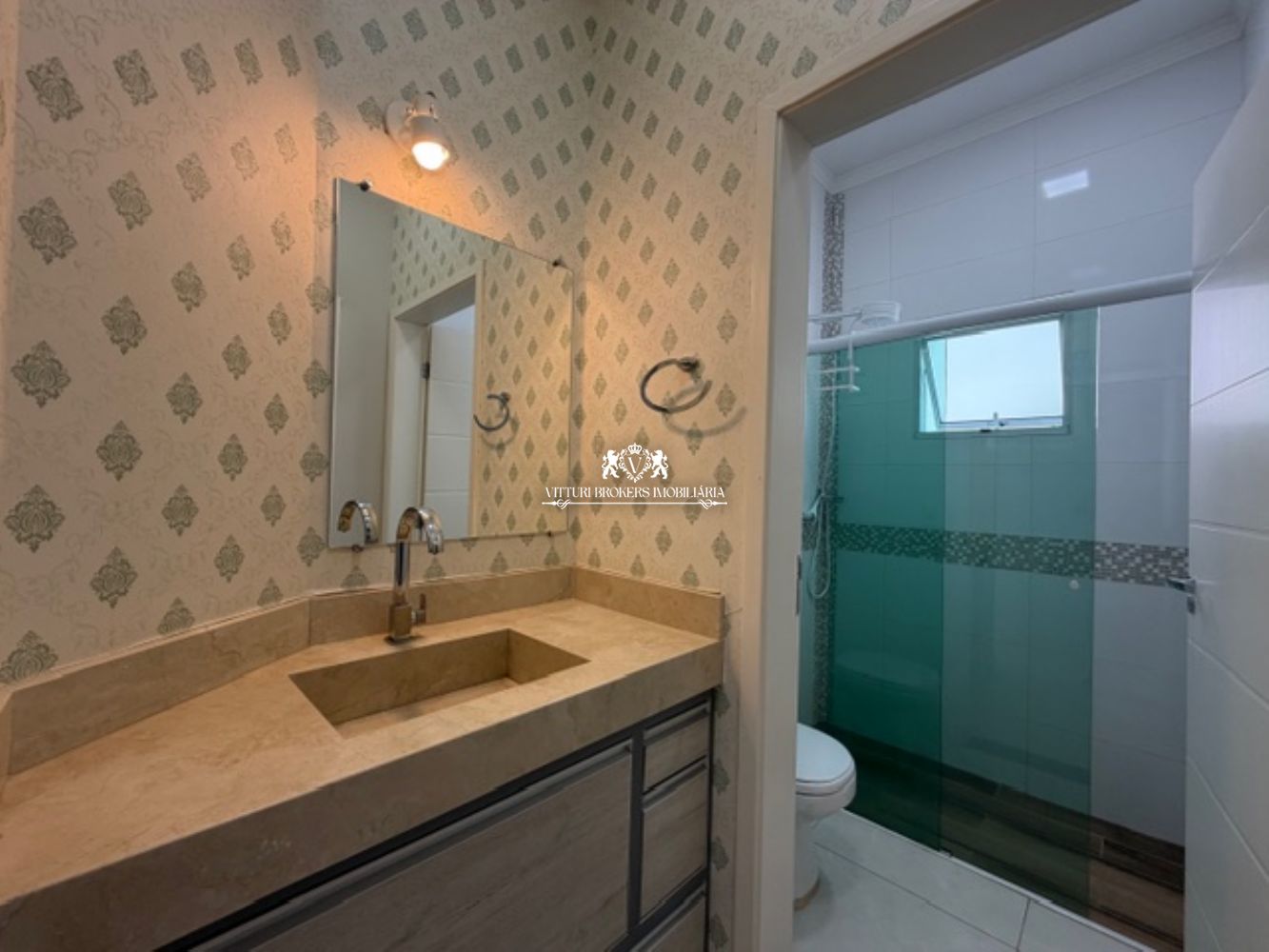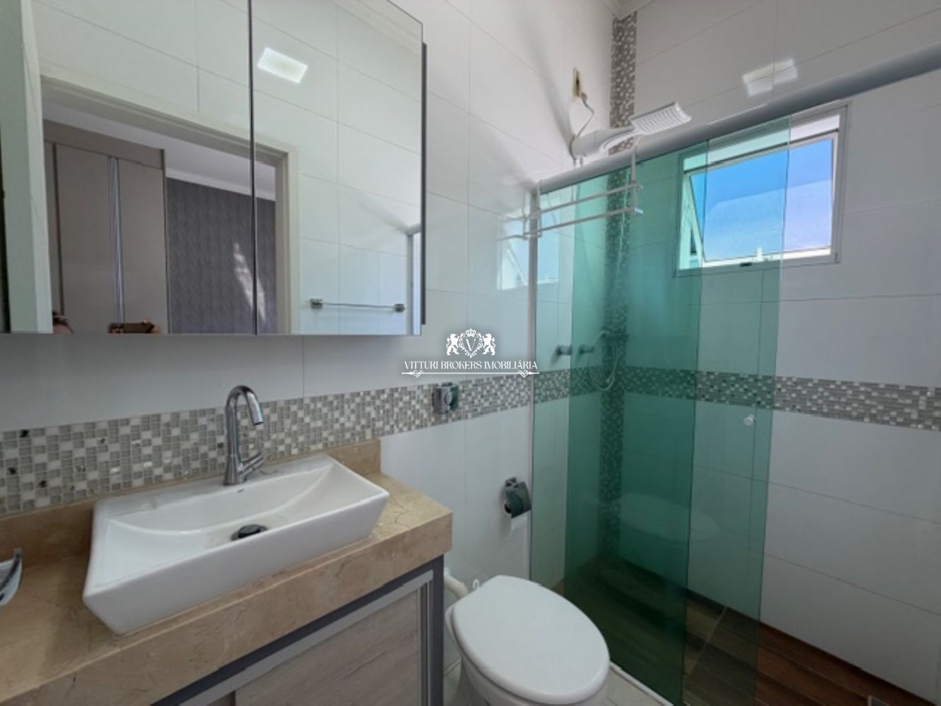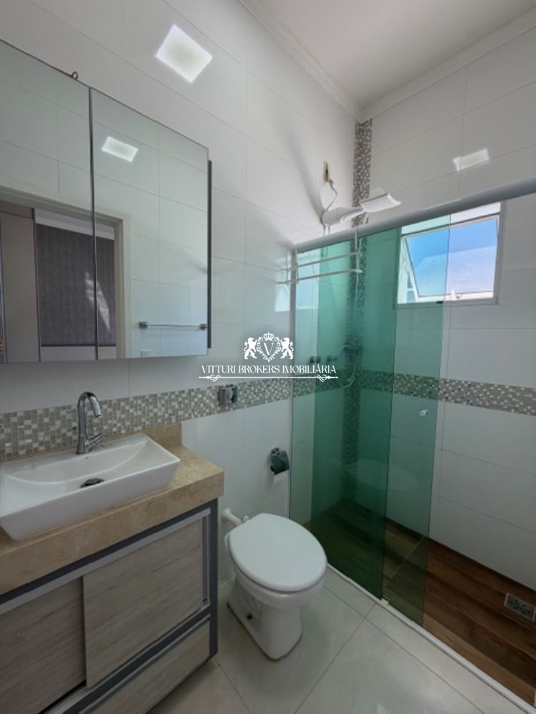 Banheiros completos com box em vidrto temperado, piso em porcelanato, espelho, cuba sobreposta com armário planejado.