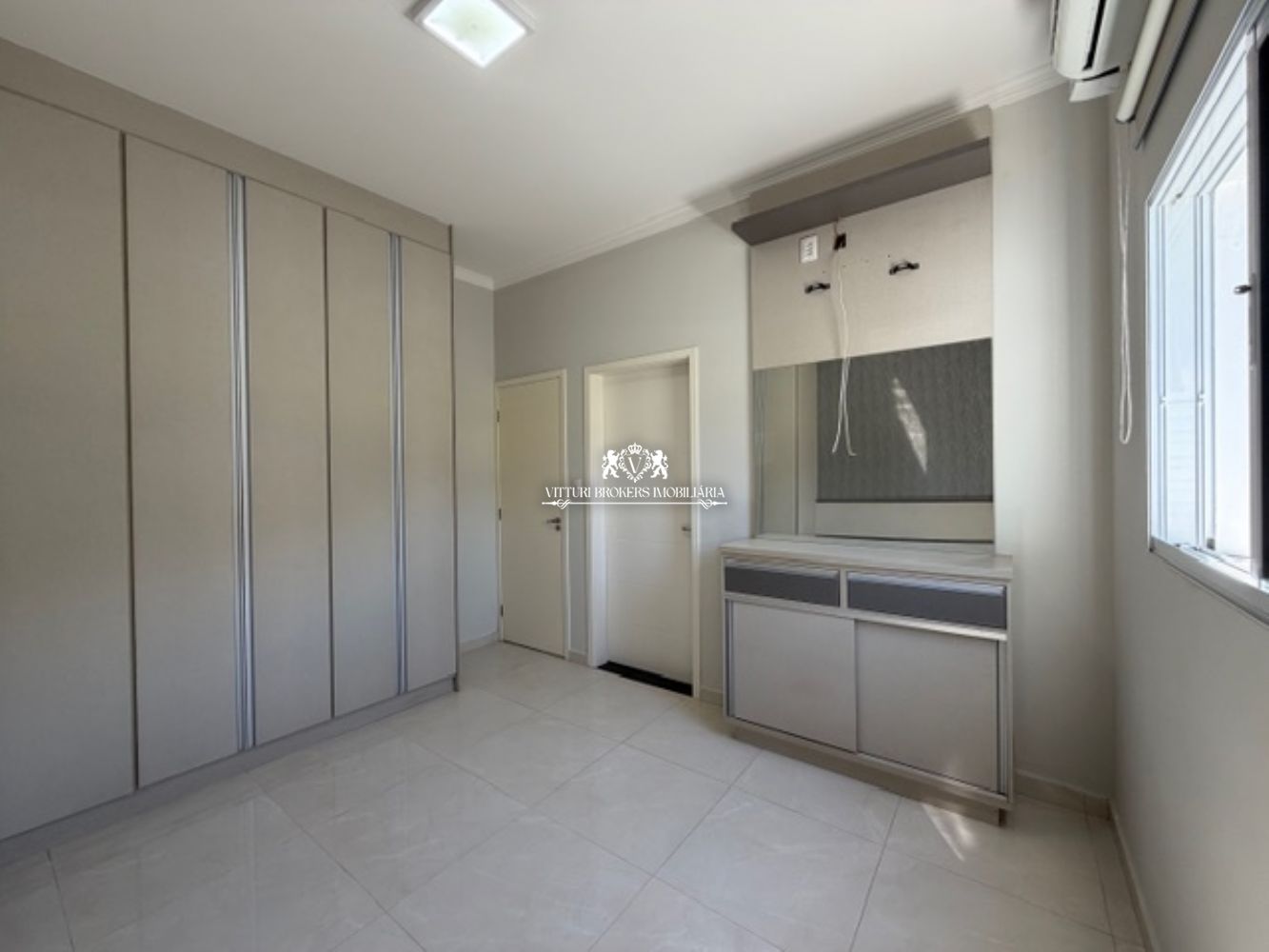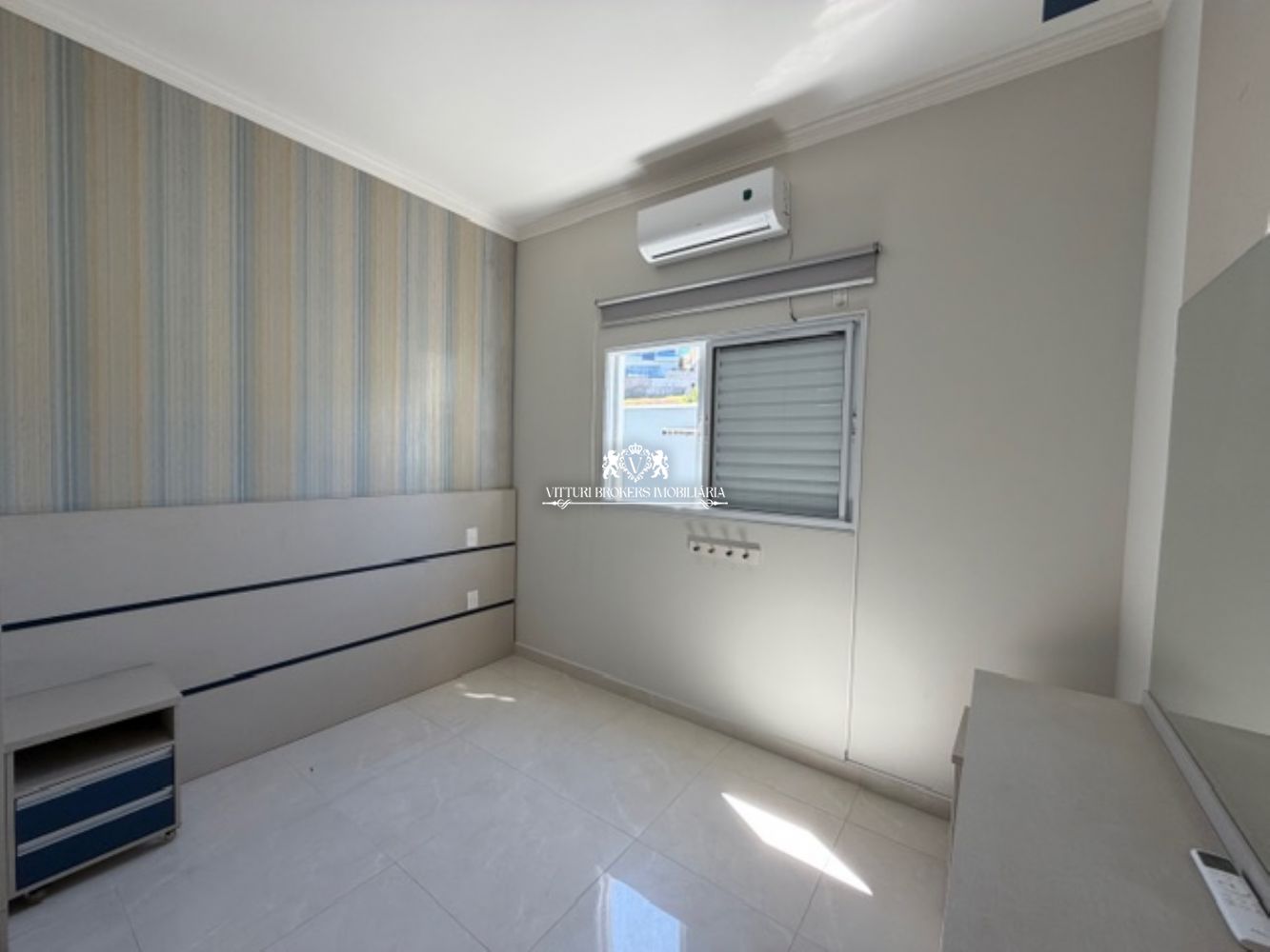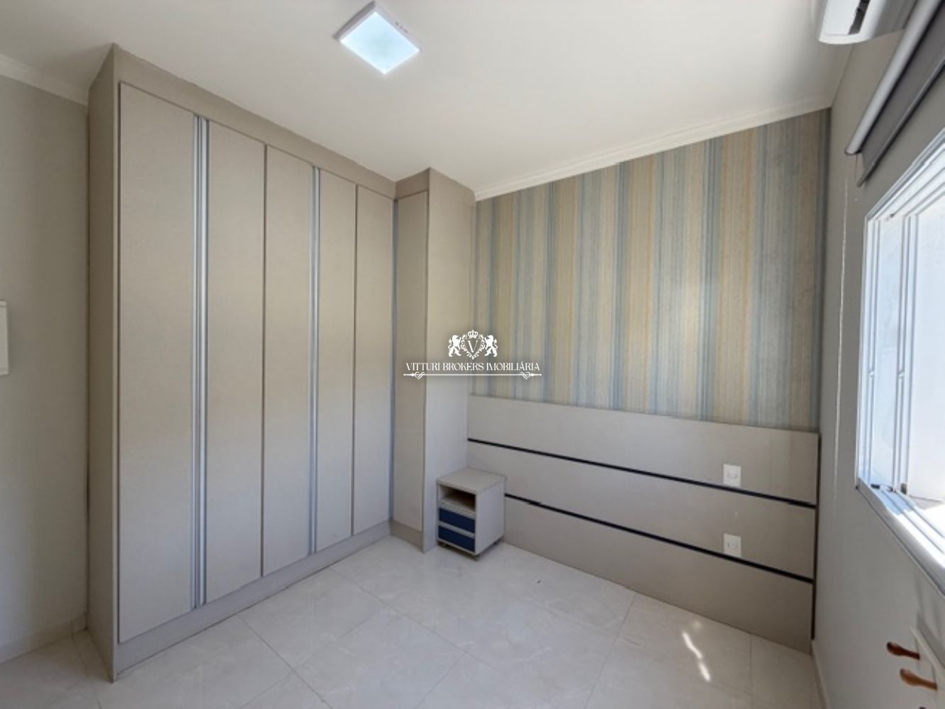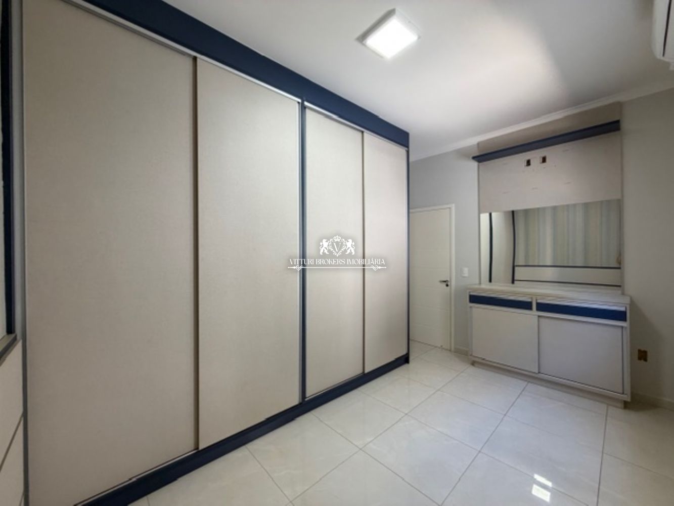 Suítes com ar condicionado, armários planejados, piso em porcelanato e cabeceira de madeira.