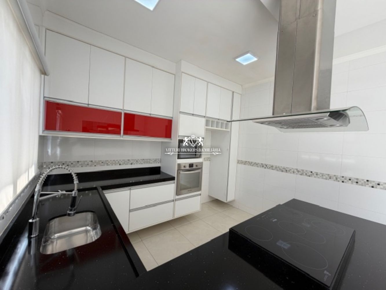 Cozinha americana com piso em porcelanato, armários planejados, ilha em granito com coifa inox e cooktop, forno elétrico, cuba inox com misturador e luminárias LED. Área de serviço com tanque cerâmico e grande armário.