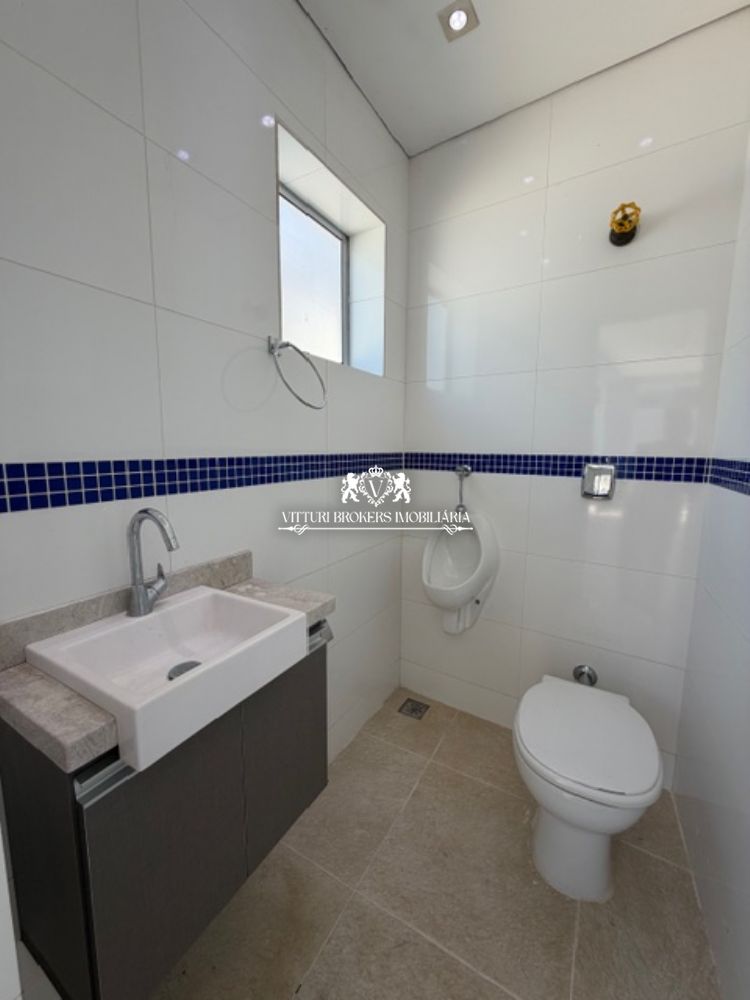 Ampla e arejada sala para 2 ambientes com piso em porcelanato, parede decorada e iluminação LED. Lavabo decorado.