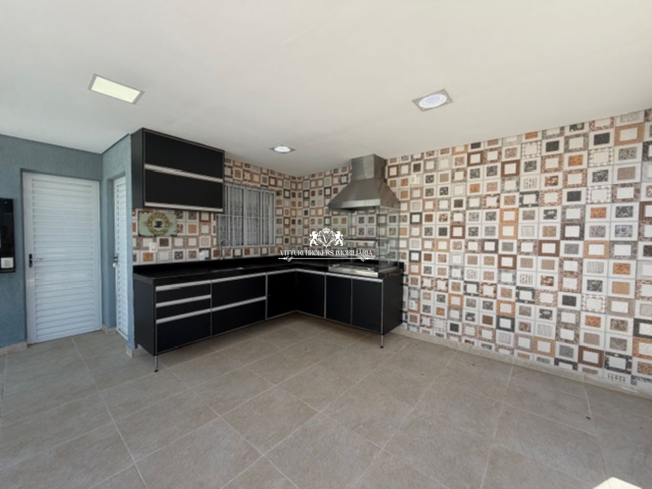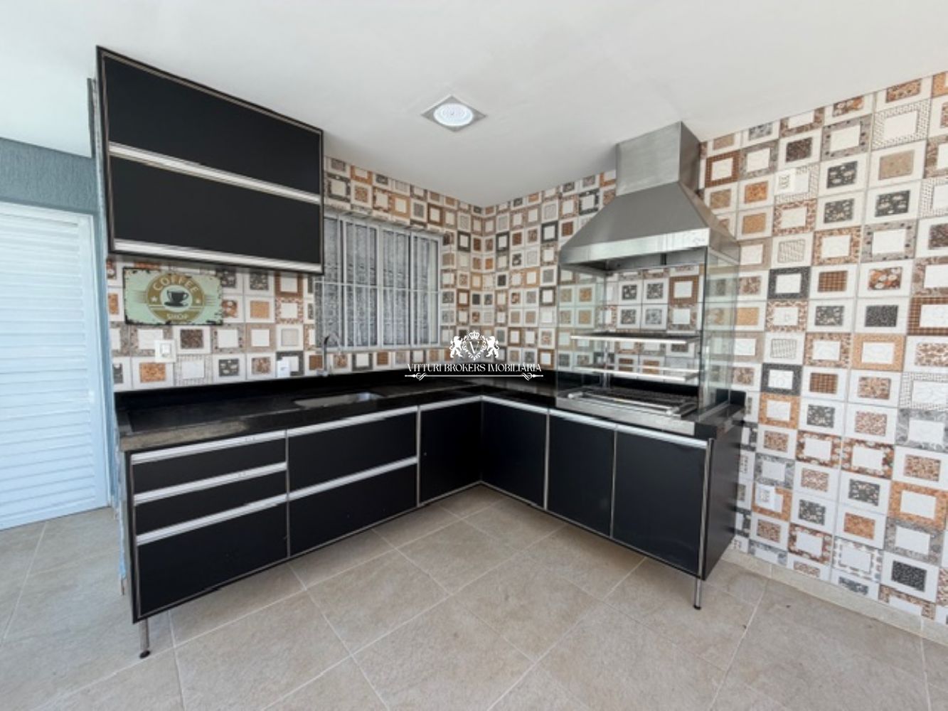 Área gourmet com churrasqueira, pia/bancada em granito, armários planejados.