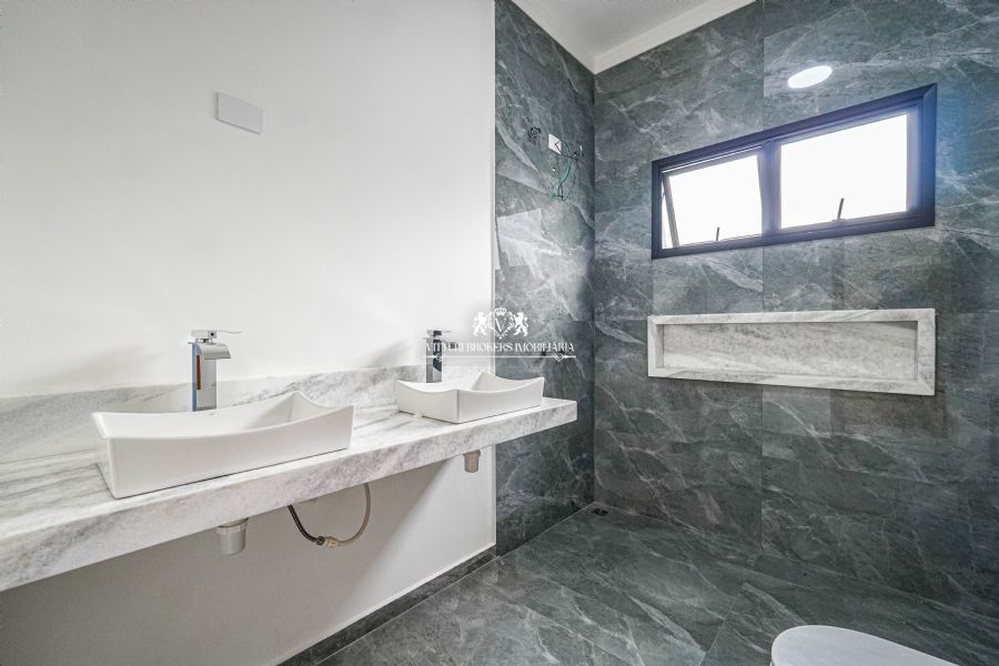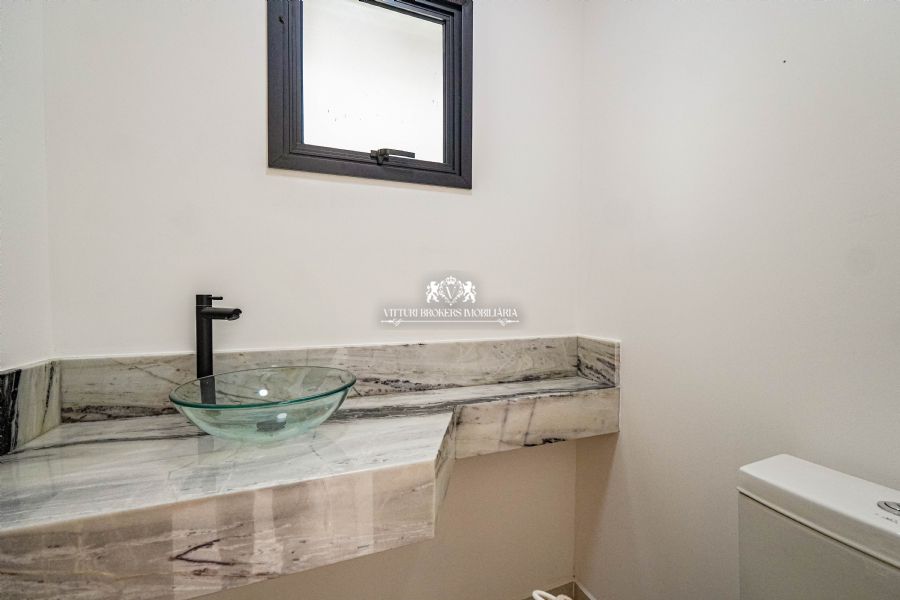 Banheiros com cubas sobrepostas, revestimento e piso em porcelanato de alta qualidade.
