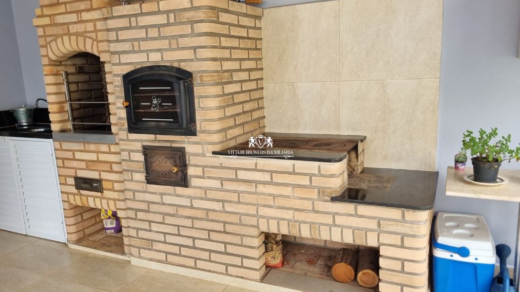 Amplo quintal com piso frio, parte coberta com churrasqueira, fogão a lenha e forno de pizza. Área verde externa. Ótima sala com piso em porcelanato, espaço para 2 ambientes, ar condicionado, ventilador de teto.