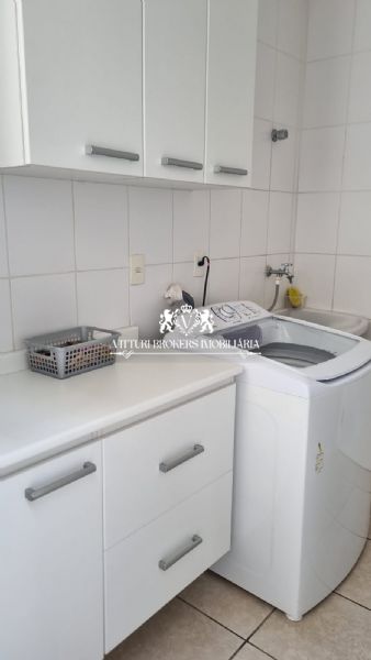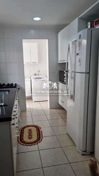 Cozinha com armários planejados, fogão embutido, conjunto pia/bancada em granito preto e piso frio. Área de serviço com armários planejados e azulejos.