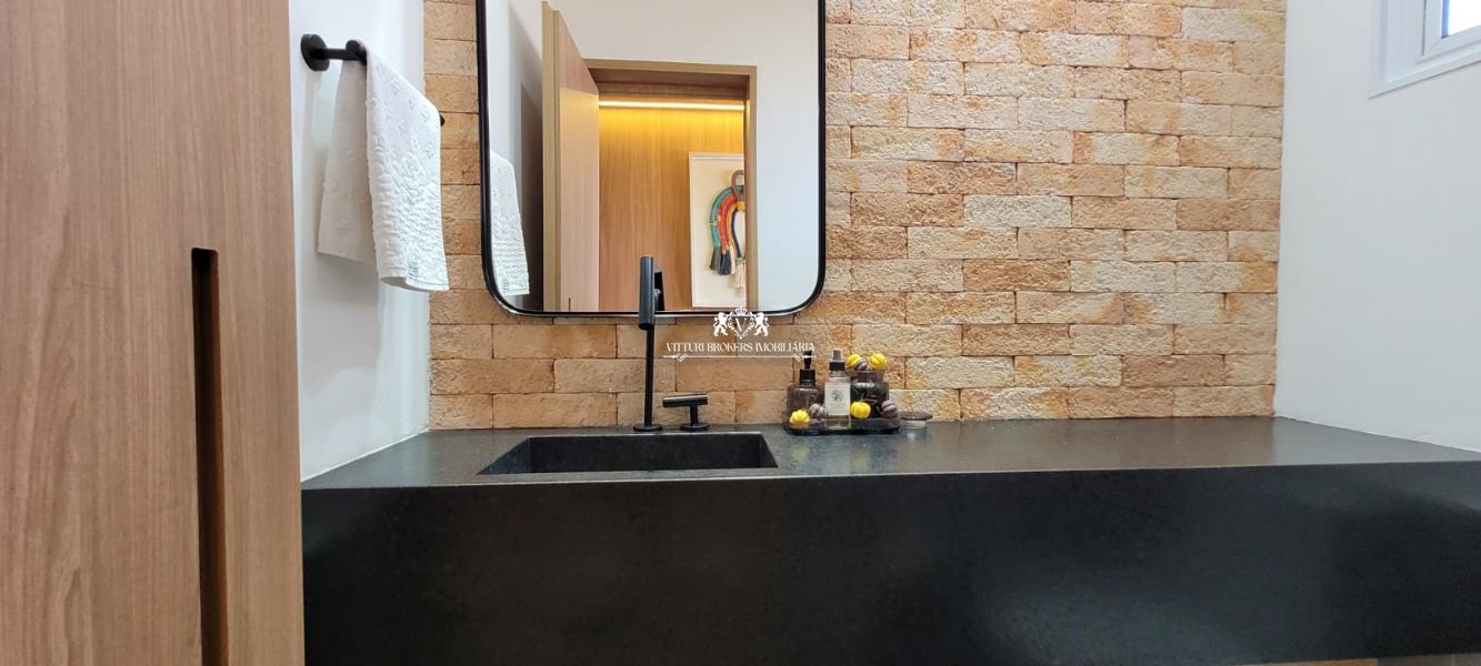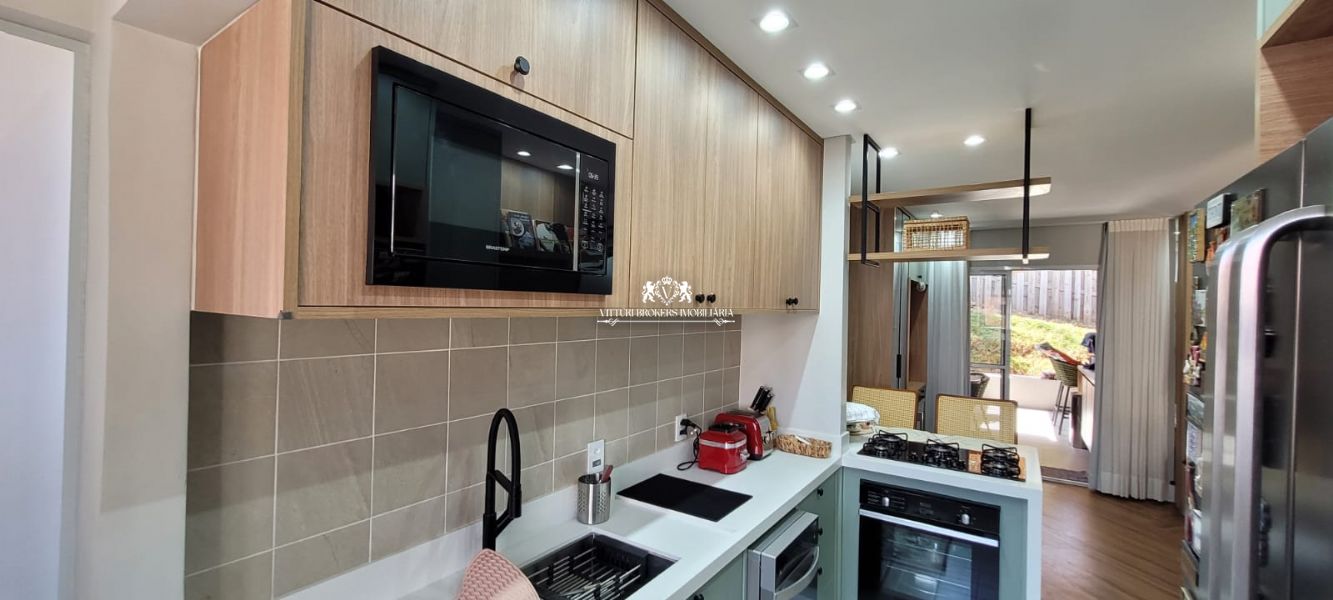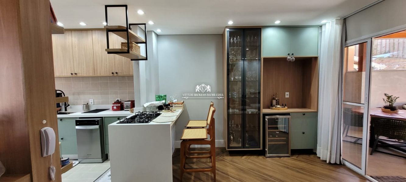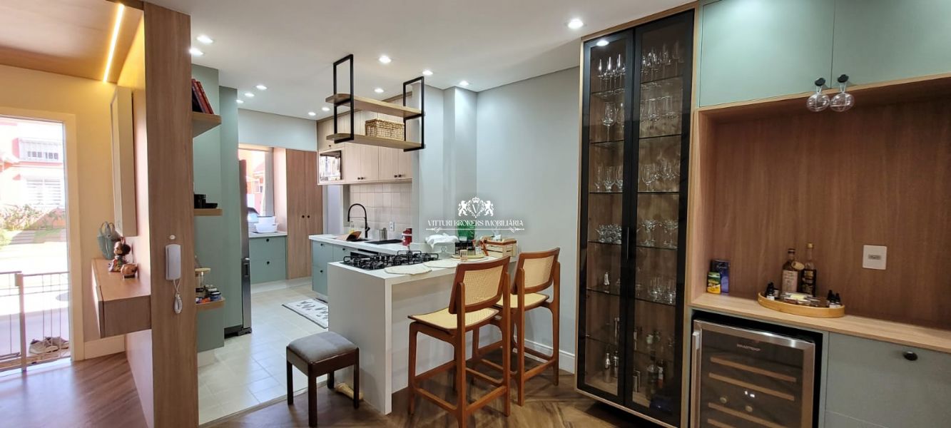 Cozinha americana com armários planejados, cooktop com forno elétrico, piso em porcelanato, pia em granito com cuba dupla, spots e luminária LED. Ampla sala para 2 ambientes com piso laminado, móvel com gavetões, painel de madeira para TV, luminária e spots em LED, cristaleira, adega climatizada e lavabo decorado.