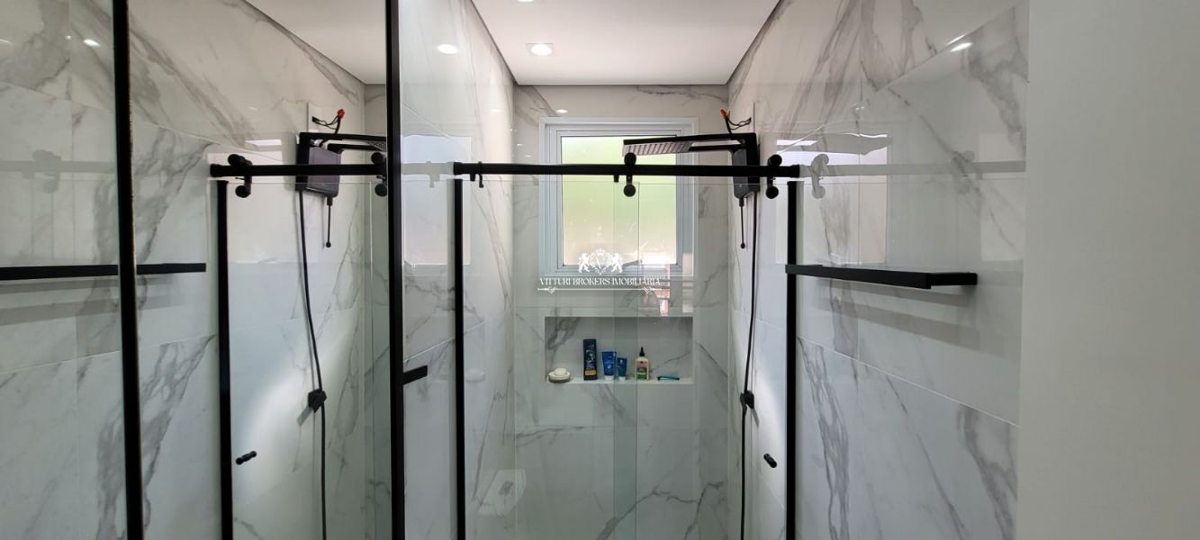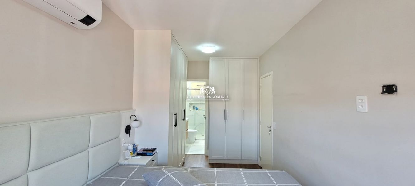 Suíte com ar condicionado, cabeceira em madeira, armários planejados, e persiana blecaute de enrolar. Banheiro da suíte com revestimento mesclado, ducha, box em vidro temperado.