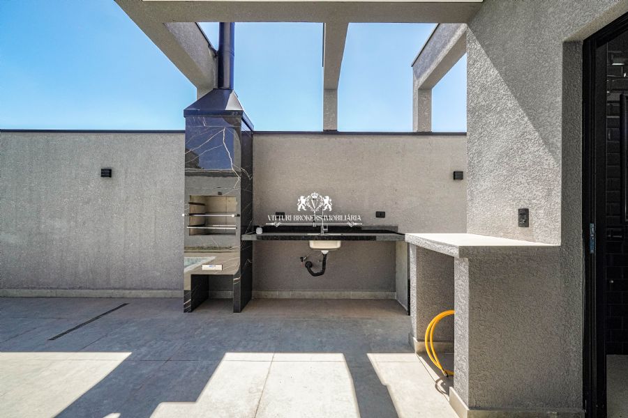 Área gourmet com churrasqueira, pia de apoio em granito preto.