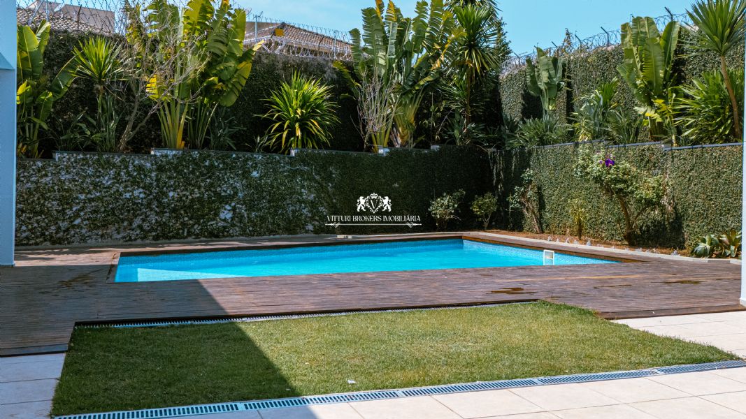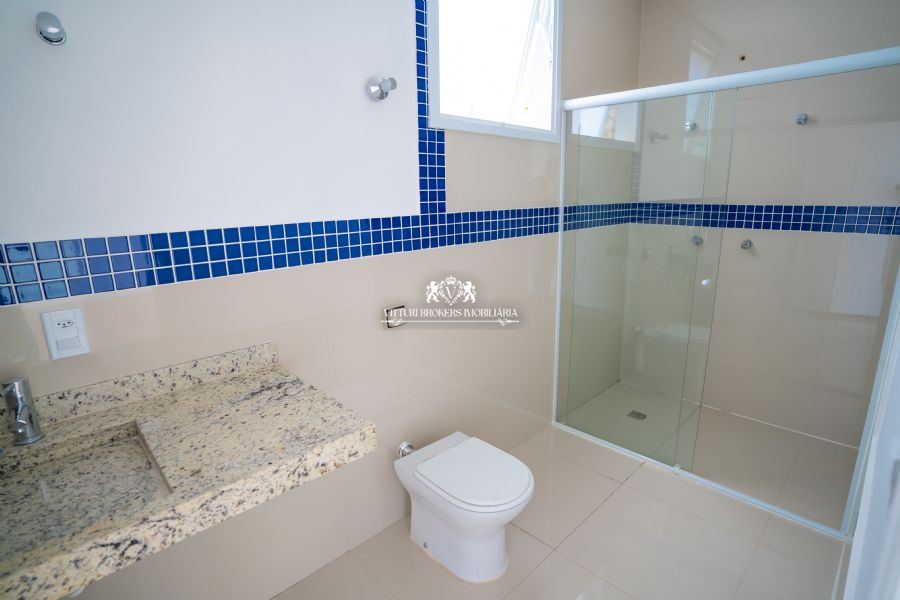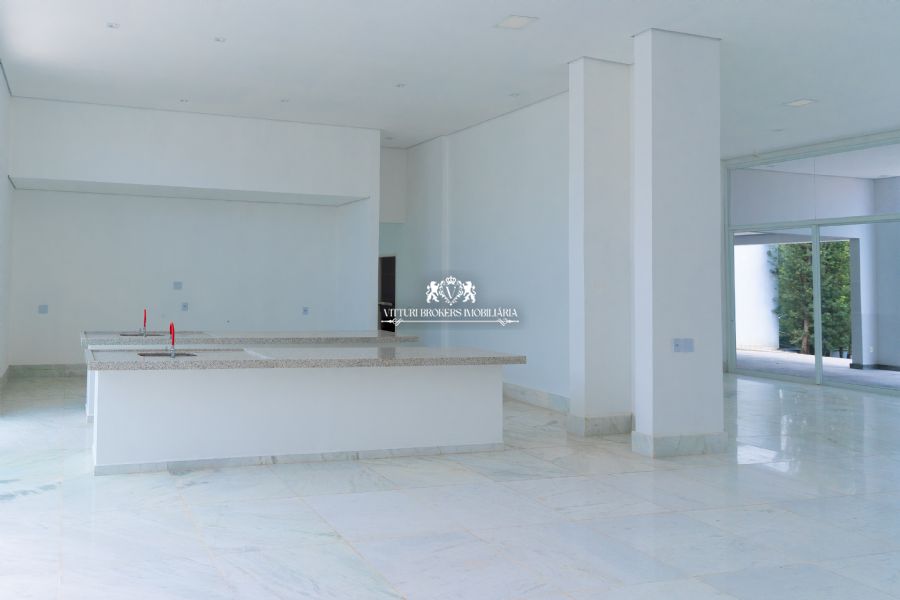 Ampla e arejada cozinha com piso em porcelanato, duas pias em granito mesclado bege com bancadas de apoio, cuba inox com torneira móvel. Despensa. Lavabo.