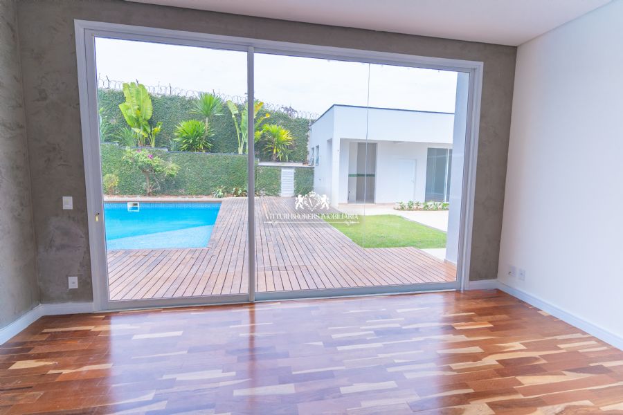 Dormitórios com janelões e vista para a área da piscina; piso em madeira; banheiros com box em vidro temperado e revestimento de parede na área da ducha.