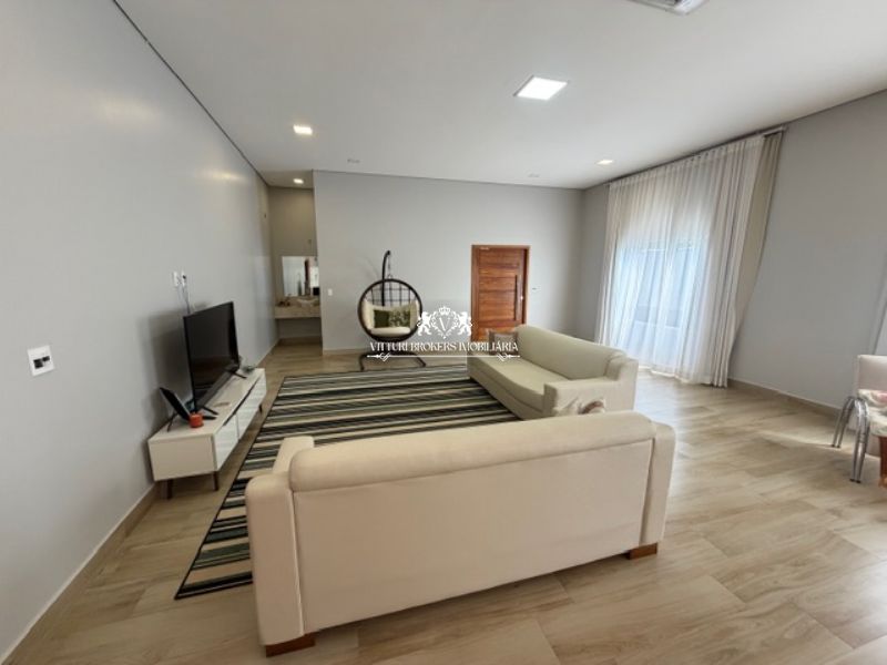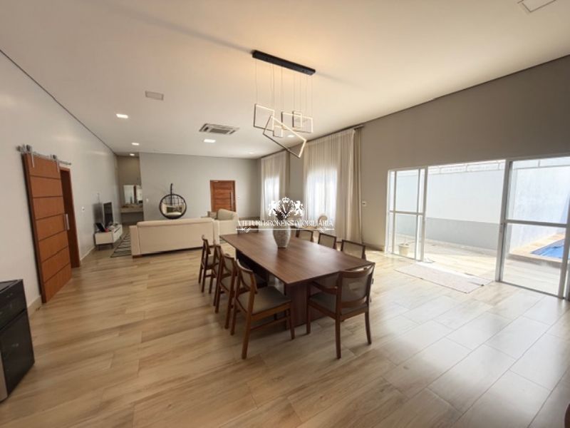 Ampla sala com piso em porcelanato para 2 ou mais ambientes, com ar condicionado central e janelões que se abrem para a piscina. Luminárias LED completam o ambiente.