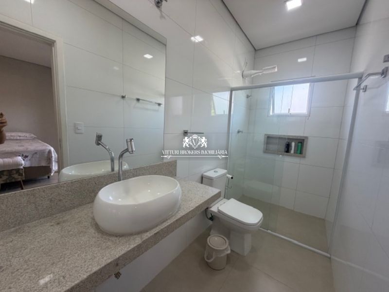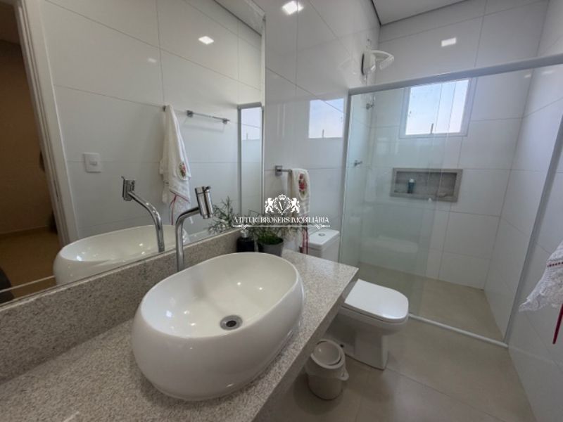 Banheiro com pia em granito, senhora e senhora, sobrepostas, piso em porcelanato e box em vidro temperado.