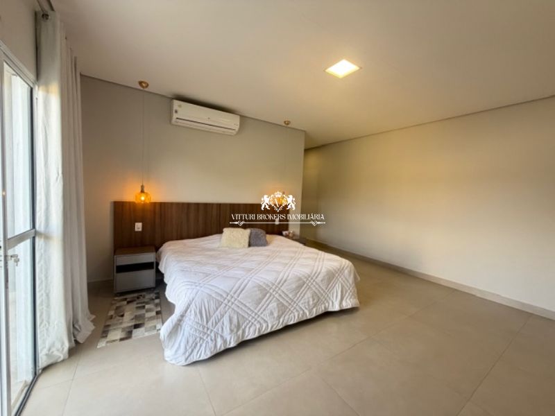 Suíte principal com varanda, ar condicionado e closet, além de piso em porcelanato.